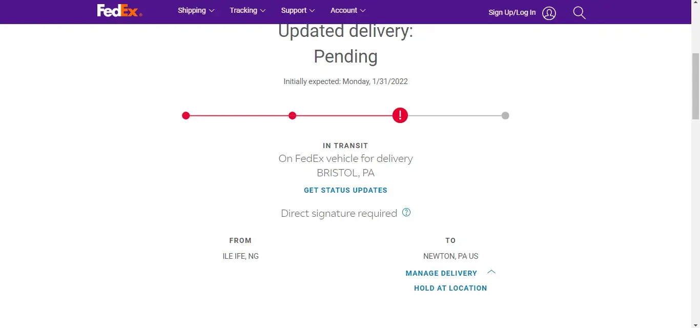 My package was shipped on Thursday, 27 January 2022 from Ile-Ife, NG for delivery to NEWTON, PA US.