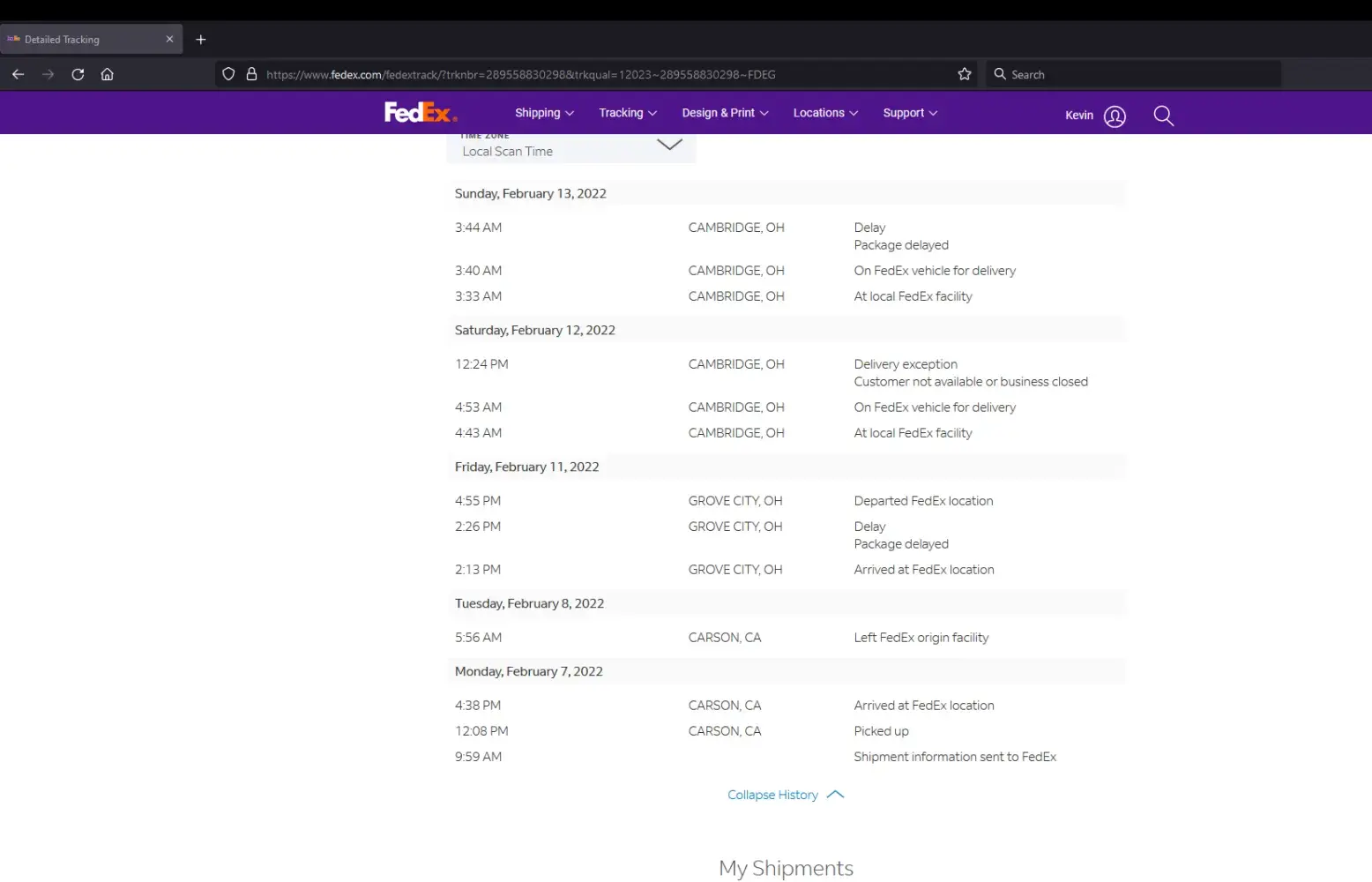 tracking [protected] was supposed to be delivered 2/12/02 however calling fedex, I was informed that the driver had an issue with the truck and now I wont be receiving my package until sunday.