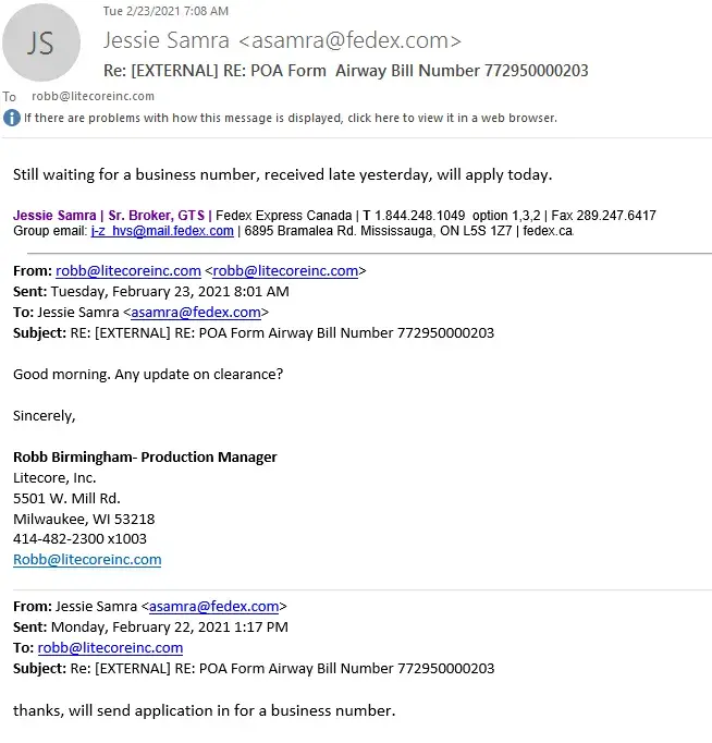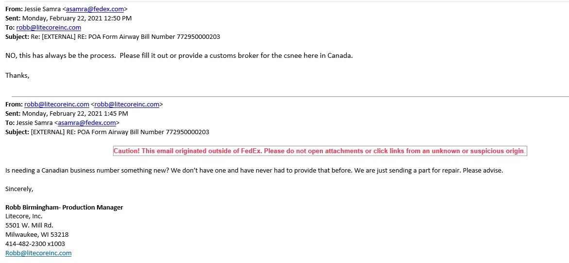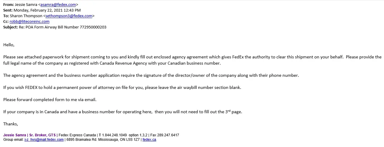 My company every so often often ships to one of our machine manufacturers in Canada. A few time now, thy have held very time sensitive packages in customs saying Power Of Attorney form was needed. First and foremost it is very difficult finding out who to contact to clear this up. Second, everytime we ship we select "Create Agency Agreement (Power of Attorney) for Non-Residents (English)" in the shipping options, which apparently does nothing. This last time we shipped, the same thing happened, only this time we were told we need a Business Number registered with the CRA. Wow! Why not provide all this info when shipping a package interenationally, and have options available when shipping? Now are time sensitive package remains held in customs while we wait for this business number to be applied for. The rep I am dealing with took an extra day to apply for it because she stated she received it late in the day (1:17pm CST). Unreal. Its like Fed Ex enjoys having terrible customer service.