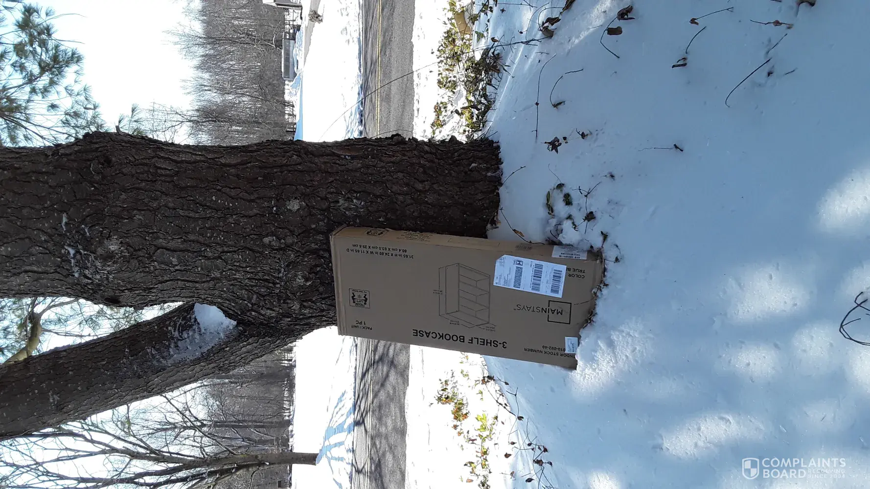 we ordered a small wooden bookcase from walmart, (not a large box, close to road and difficult to see from house, see picture), delivered today, february 20, 2021, 11:15am. this is accurate as we were pulling into our driveway as fed ex truck was leaving. unfortunately, we found our purchase leaning against a tree, IN the snow, without a plastic bag or any sort of weather protection. there was nothing to stop him from driving up our driveway, to deliver on porch, as it was in no way impossible to navigate (see picture.) since we have previously dealt with other unprofessional deliveries we even have a 'request' sign posted on our driveway now asking specifically for porch delivery as it has been, on occasion, still left on driveway. today's delivery was unacceptable as product could have been easily missed out by road and/or damaged from long wait in wet snow had we not been there to retrieve it immediately. additionally, the time lapse between 'delivered' email notice, which hit our email at 11:49am, approx. 34 minutes, and actual delivery was enough time for possible product damage. we understand some delays can be due to the current situation and are tolerable but disrespectful mishandling shouldn't be tolerated, especially when it becomes repetitious. thank you for your attention to this situation/problem as it now appears to be commonplace.
