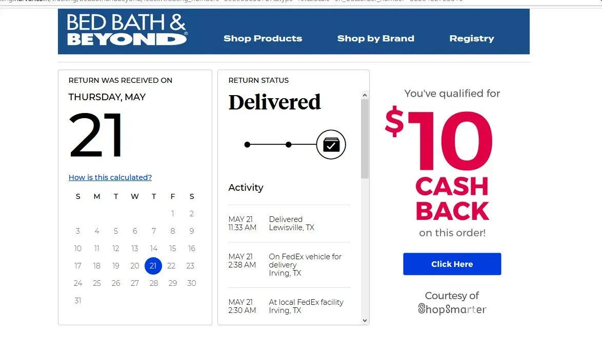 On May 9, 2020, I placed an order online for a set of glasses and a salad bowl. Both arrived on May 14, 2020. The salad bowl was not what I expected and frankly, did not look suitable to serve food in, so I started an online return at the Bed, Bath & Beyond website. Following their directions, I repackaged the salad bowl and took it to a FedEx office in Olathe, Ks. The FedEx tracking number was [protected]. When I did not hear from BBB about the status of my return or receive a refund, I started tracking it online. BBB makes it incredibly difficult to find information about returns on their website, but eventually, through trial and error, I found it at this URL: https://tracking.narvar.com/tracking/bedbathandbeyond/fedex?tracking_numbers=392935658787&type=ret&locale=en_US&order_number=BBB6482735810. This is where I learned the salad bowl had been received by a fellow named Ewing at BBB's Lewisville, TX facility on May 21, 2020 at 11:33 a.m.