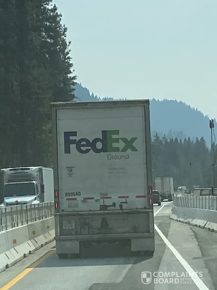 The Fed-Ex Driver was speeding at 75 plus mph on hwy 5 from Weed Ca towards Redding Ca on Saturday August 29th between 2:00 pm and 3:00 pm. This driver was in the far left lane the whole time and passed us on the right at a place where the right lane was closed for construction almost hitting us. We Saw this truck off and on driving badly. Please see photos for Truck ID number. The driver was an older male with glasses and a beard. Any questions call Ray West at [protected]