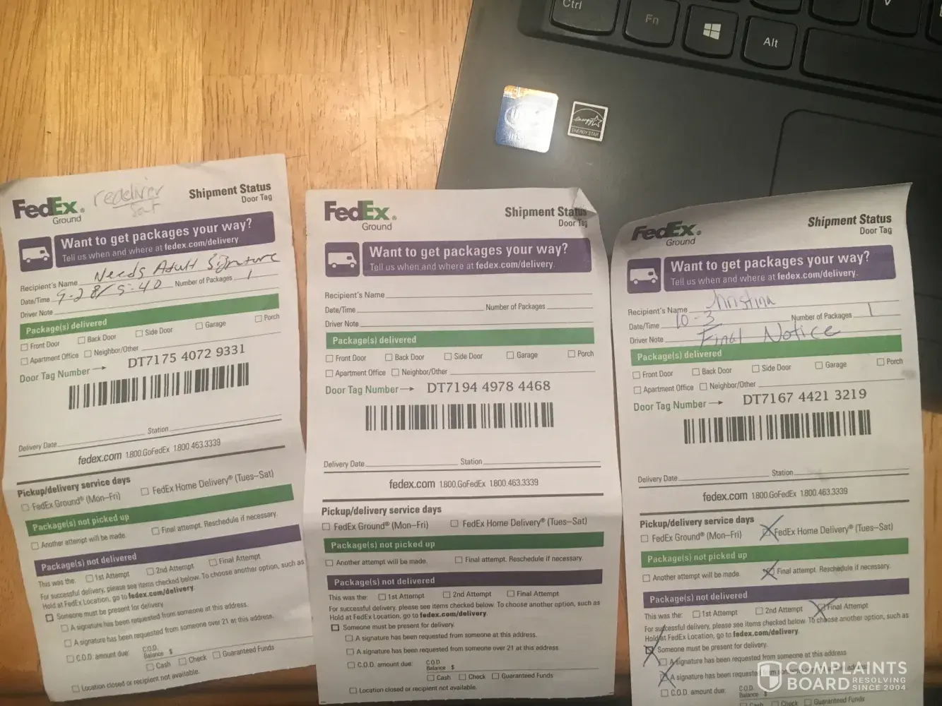 Oct.3 I got from my son a text after he got home from school a picture that again fed ex came to the house to deliver the package!