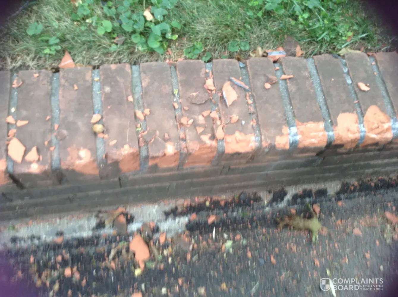 On August 26, 2016, a fed ex ground truck had a blowout in front of my house at 2:30. The driver stated he was waiting for a tow truck, which subsequently came about a half hour later. The truck was jacked up and taken away. When I went outside and looked at my brick retaining wall had 5 feet of damage. The top layer of bricks were all missing about 1/4 of an inch.