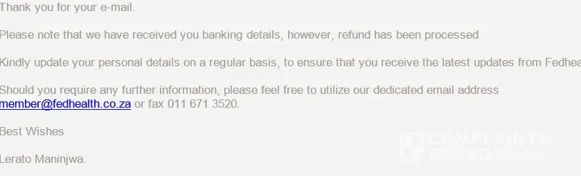 On Friday the 20/09/2019 I received an email from fedhealth advising that i have a refund of my savings due to me and it will be processed by the 25th of september.I then contacted Fedhealth to enquirer which details this refund was processed into due to the following reasons