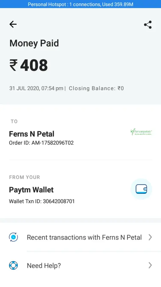 On 31st july 2020, I was planning to send rakhi to my brother through ferns n petals. The total was 408 and I paid through paytm. The amount has been deducted from my account, even I have a proof which I got from paytm. As soon as I paid for it, I thought I would receive an confirmation email or text, but sadly I didn't receive that also then I check my account in fnp. The status was waiting. The order id is 17582096. It was supposed to reach today, i.e, 1st august 2020. I have been trying to reach them through their customer care number. 10 mins on the call, still got no reply. I was using it for the first time, and now everytime I generate a complain ticket, they close it without solving my issue. I feel so sad and irritated at the same time. This is not done. Please help me out.