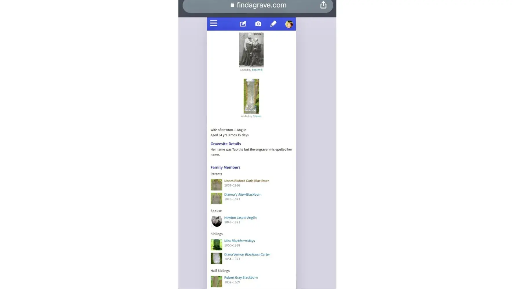 Ruby is right. I dont like findagrave too. Non related people can steal your family (Dead family dead friends) photo/headstone, and put online in their name on creator list, when you ask them transfer to you, they said no and even claim to staff you harass they. Then you are suspended. Nobody would love f## site.