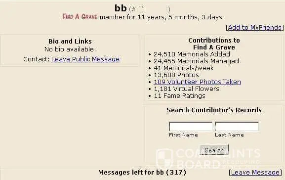 Because I had such a negative experience I began doing research on this company. I was amazed at all the negative comments surrounding the findagrave website. When you are the one going through it, you don't realize that others have had the same bad experiences and in some cases much worse ones. There are legions of people complaining about the website. I thought pissedconsumer.com and complaintsboard were the main venting places, but there are many others all over the web.
