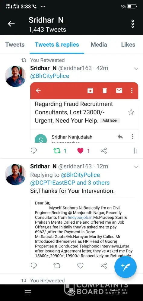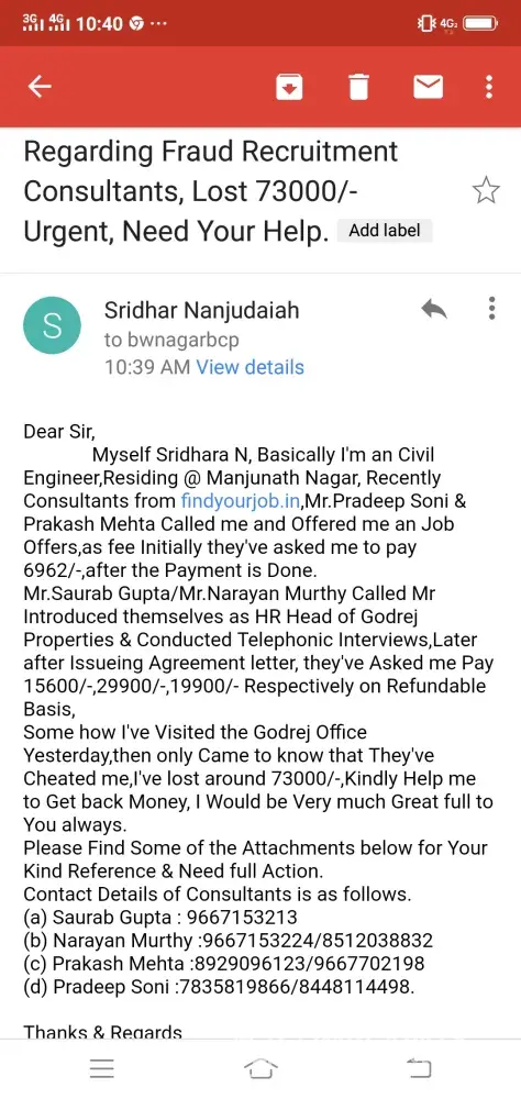 Sir, Mr.Ramu Singh/Saurab Gupta/Prakash Mehra/Pradeep soni/Narayana Murthy & Team, Cheating Employees by Creating fake Online website/Fake Godrej Offer Letters, They'll Introduce themselves as HR Head of Godrej Properties, Conduct telephonic Interview, Ask/Demand us Pay Amount of 6932/-, 2000/-, 27900/-, 19900/-, Kindly Resolve this Issue on top priority.