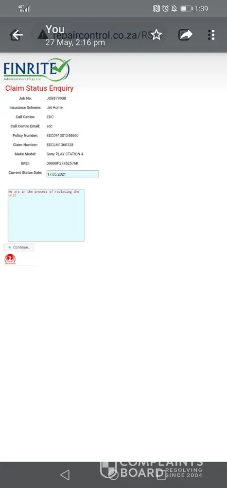 My cell phone is in for repairs...I spoke to a call center agent and requested to have a few of my insurance policies cancelled..,they could not even do that over the ph... monitor administrator has requested paperwork from finrite ever since my ph was at the shop... nothing has been done so far...I don't know if your call agent's know what they are doing or if they just stupid...I'm claiming for a A 11 Samsung...they put on the system I'm claiming for a Samsung J4 core..