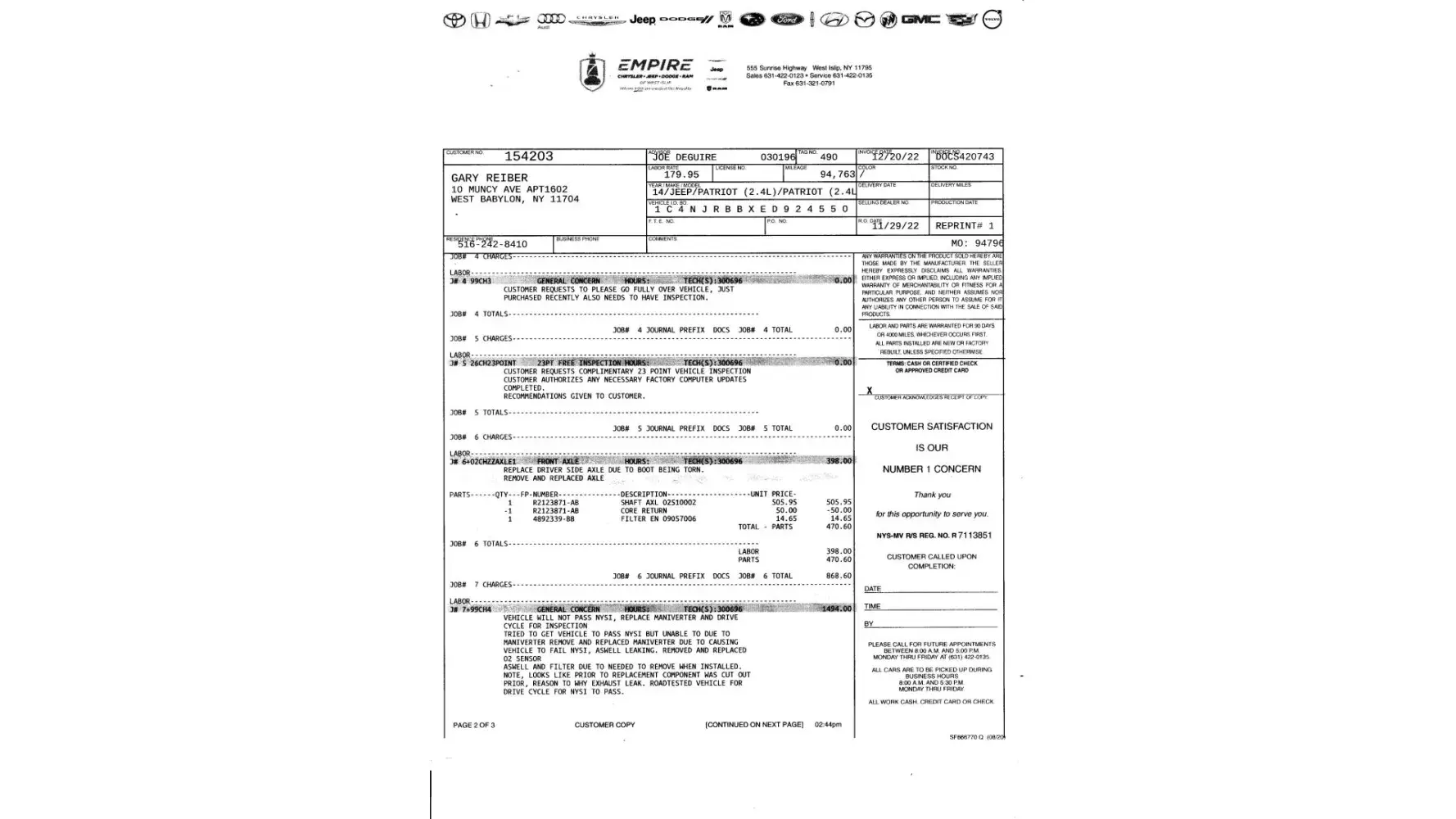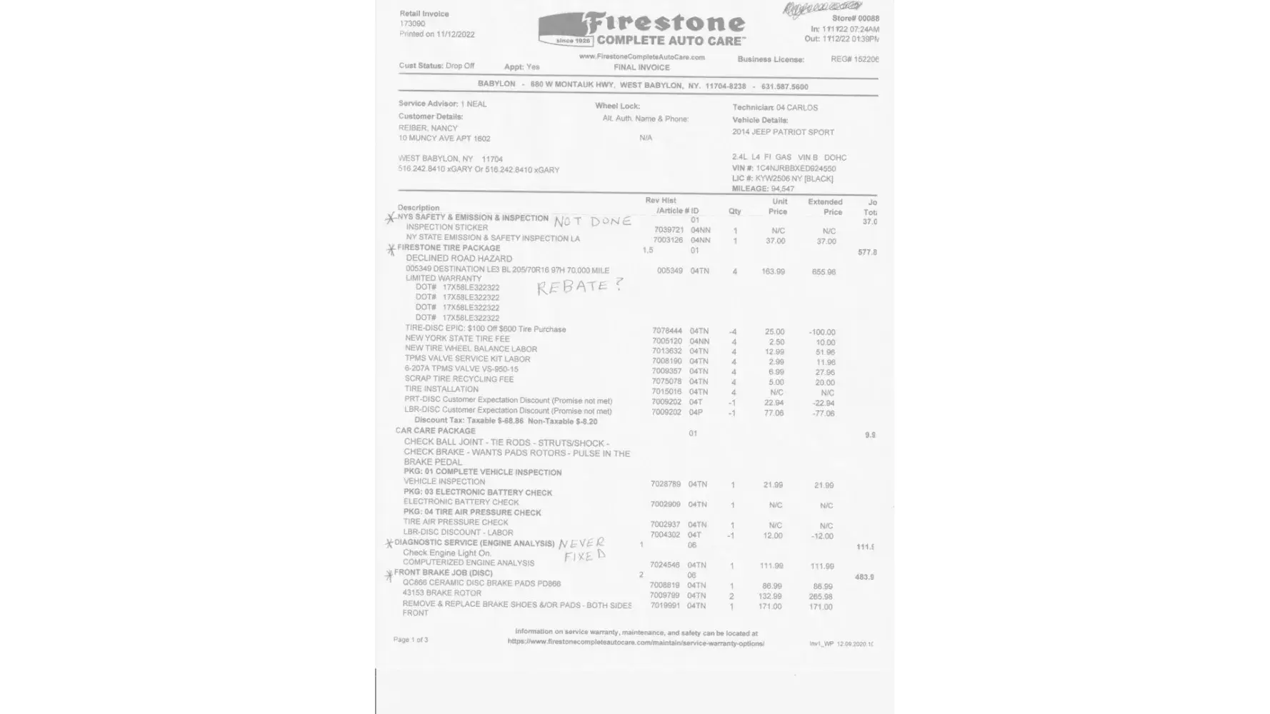 0n 11/12/22 I took my 2014 Jeep Patriot to Firestone Complete Auto Care (store #[protected] W Montauk Hwy West Babylon NY 11704 for an inspection & tires. Service Department was not able to get the car to pass inspection after I spent $4202.24. Manager told me to take to a dealership - Empire Jeep in West Islip NY passed the inspection and fixed the substandard repairs done by Firestone.