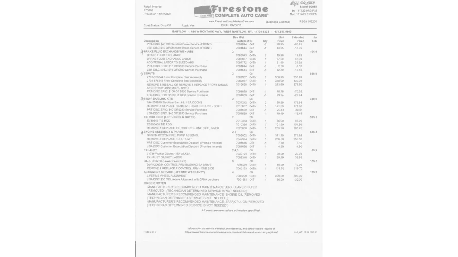 I can do all the work myself but due to getting older I prefer to have someone else do the work, but now I have to do the repairs. My opinion is that either the parts are not properly installed, or you offer substandard / cheap aftermarket parts. Feel free to look back on all my service/repair records and you will see it's true as Firestone is the only place I have taken my vehicle since it was out of warranty.