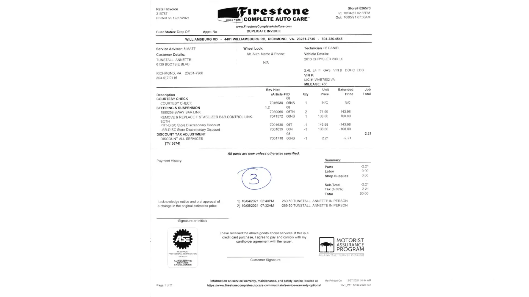 10/04/2021: Brought my car in for service to from firestone complete auto care – 4401 Williamsburg Road, Richmond Va. 23231. Upon leaving the shop, I notice the reason I brought my car there was not resolved. Car was making clicking noise when I turned and crackling noise when I was driving the car. I turned around and brought the car back to firestone. The mechanic who replaced the parts stated that he could not hear any noise (he heard it. He choose to ignore it). So he replaced the stabilizer bar control. I proceeded to drive away only to find that the issue and the reason my car was serviced there was not resolved. Car was making the same noise it was when I brought it there to be fixed and continued afterwards. I called firestone again and brought my car back on 10/18/2021. They scheduled an appointment with Hayley Chrysler and Jeep for an inspection. I informed firestone that I was going out of town end of October 2021 for surgery and will not be back until December 2021. Appt with Hayley Chrysler and Jeep was set for 12/27/2021. Car sat in the garage for the entire month until I returned.