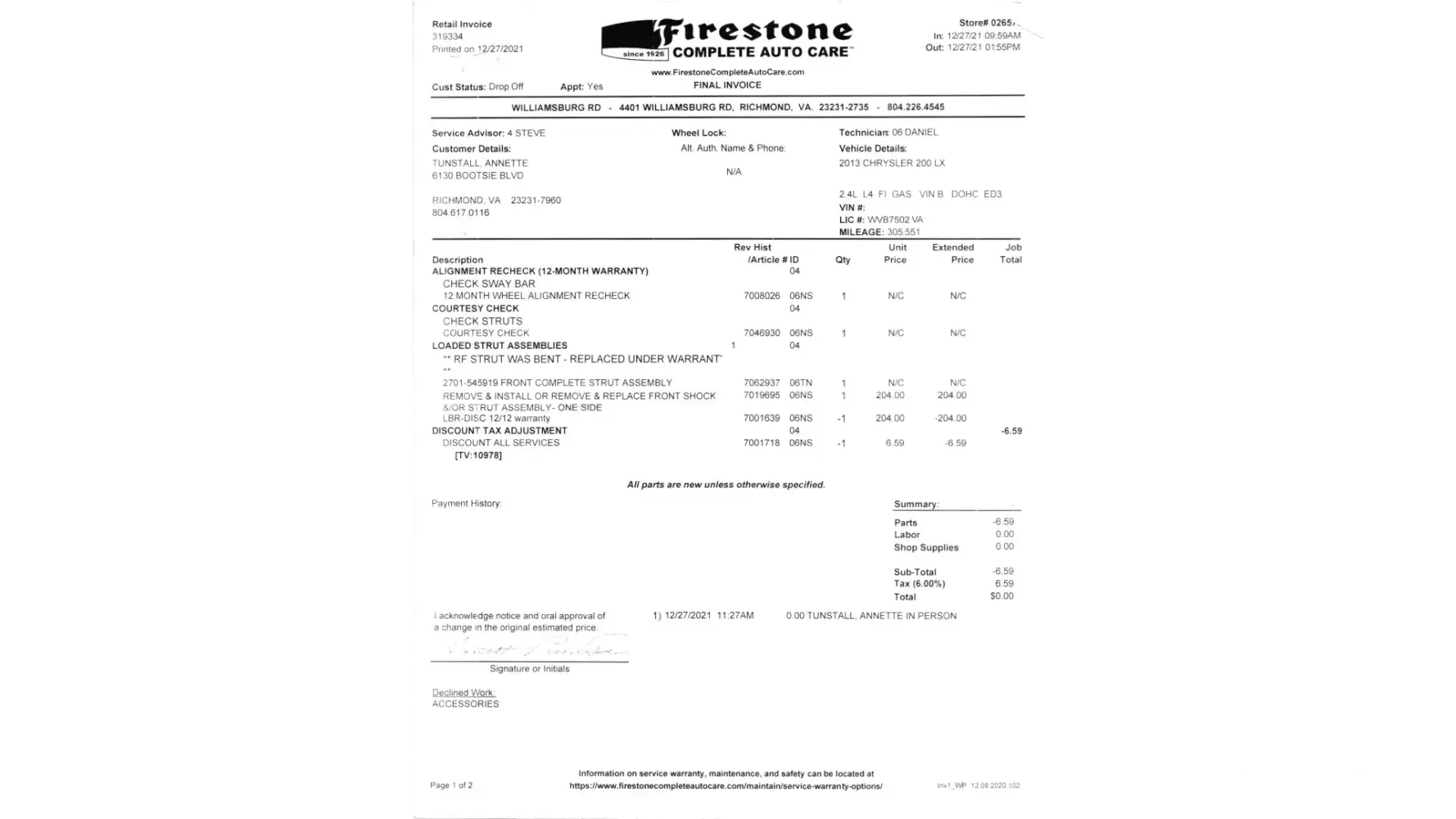 12/14/2021: I took my car to Bill Talley automotive who ran a diagnostic on the alignment done. I notice my car was pulling on one side. Found that the alignment done by firestone was off (left and right front side) and the right front strut assemble was bent. I contacted firestone immediately. They already noted I had an appt with Hayley Chrysler and Jeep. So I parked my vehicle because it was not safe to drive.