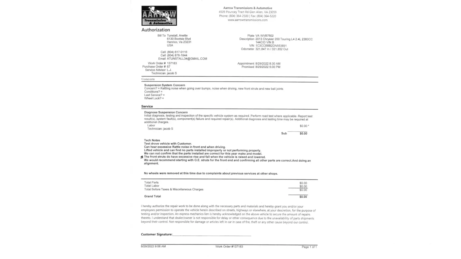 12/27/2021: Drove car to Hayley Chrysler and Jeep where as they indicated what Bill Talley automotive stated and they noted that the struts where off market struts (something they do not recommend for my car) I drove car to firestone complete auto care – 4401 Williamsburg Road, Richmond Va. 23231 where I confronted them about the off market parts they place on my vehicle without my knowledge. They stated that the part replaced has a life time warranty. I careless about a lifetime warranty. I want quality work and performance to which neither was given to me for the price I paid. Once they replaced the strut and conducted a before and after alignment, the tech tells me that they cannot do anymore alignment because of right front which will require a camber replacement (on the same side as the damaged/ replaced off market strut). It wasn’t damage when they did the service now it needs to be replaced and I cannot get another alignment until replaced. (But I’m supposed to have an alignment warranty with the repair done 10/4/2021).