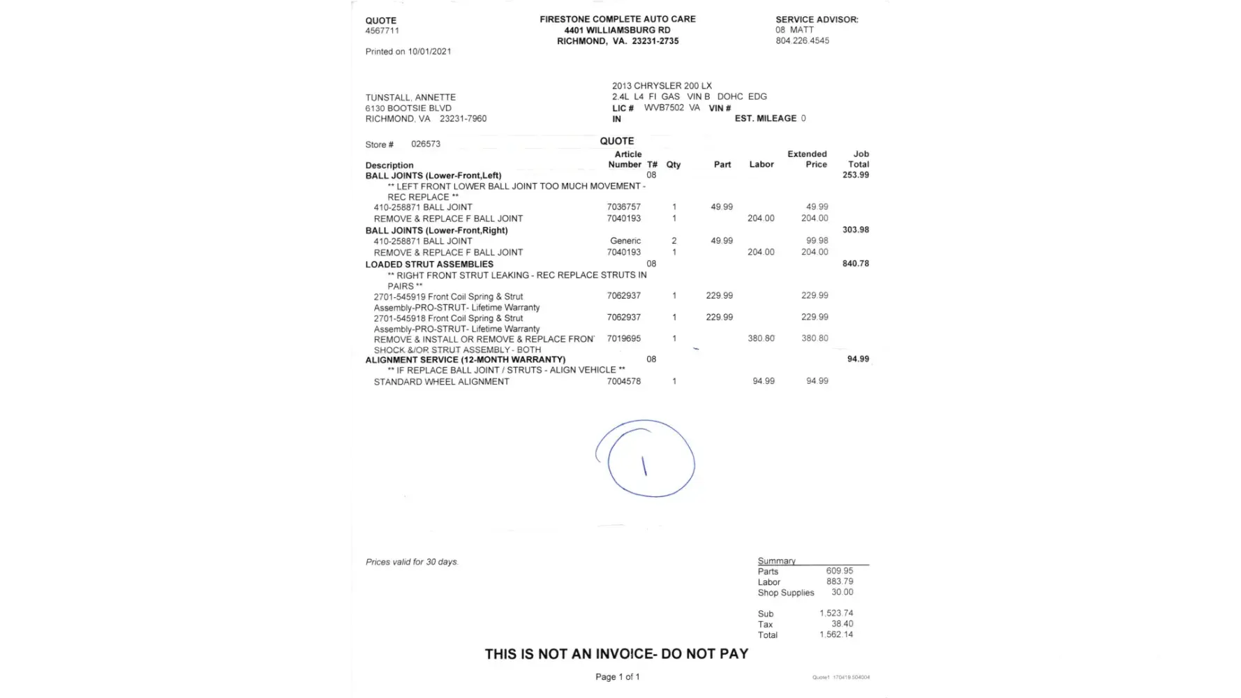 10/01/2021: Received a quote from firestone complete auto care – 4401 Williamsburg Road, Richmond Va. 23231 stating that I needed to replace ball joints (left and right), struts and alignment after they test drove my car.