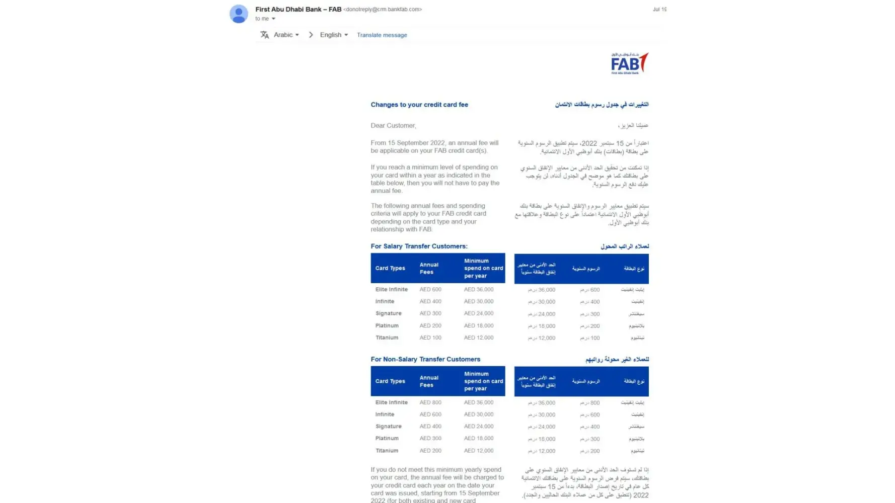 I had opted for FAB Cashback credit card (ending with 6873) in March 2022 and I was informed that the cashback card has zero annual fees for the first year and second year onward it would be AED300+VAT. But from 1st May 2022, apparently bank decided to revise those charges and make it AED500 + VAT for non-salary transfer credit card holders. However, I was never intimated or communicated about this revision of the charges.