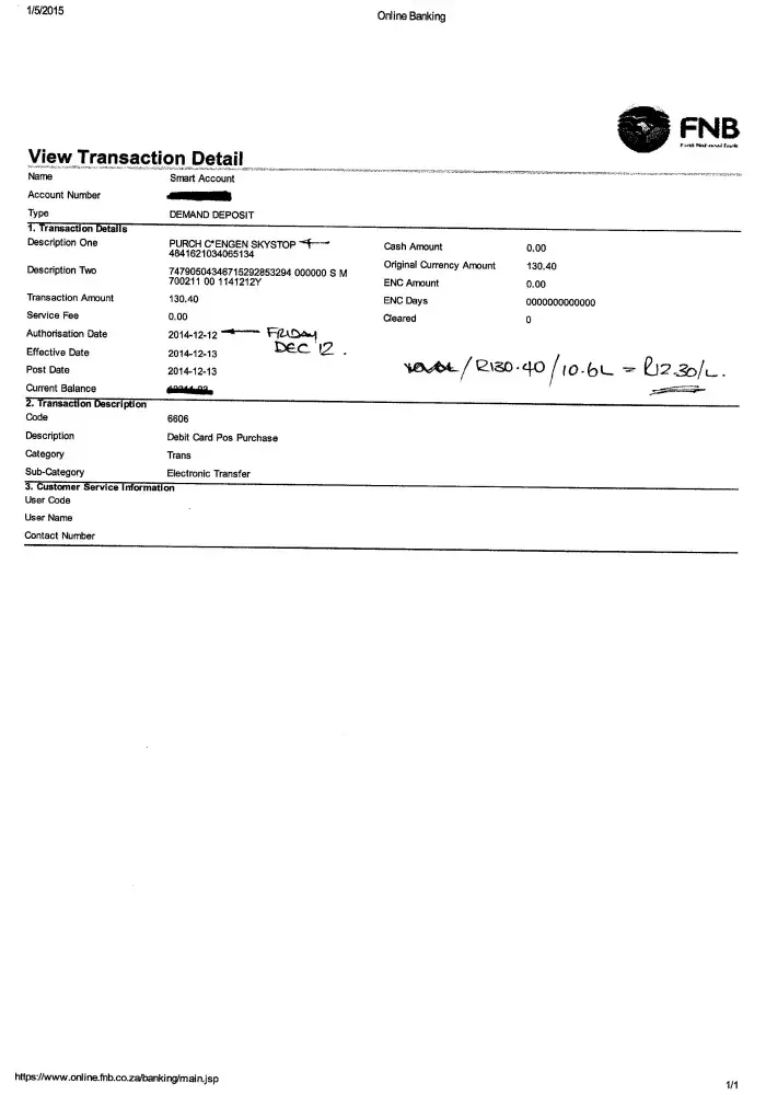 Rented a small Polo Vivo 1.4L for 24hrs on Dec 11th. Wife used it for 191kms, filled up and returned it filled up to OR Tambo Airport on Dec 12th. I had to leave a R3000 deposit on my credit card (should have been R2950 according to our booking with you). I was subsequently charged an additional R167 for 13L of fuel, ostensibly as the cars have a problem with "airlocks" when being refuelled (they should have breather tubes which overcome this) and we didnt quite fill the car up. They have charged me over the fuel price per liter at that date, despite advertising there is no refueling charge. However, more significantly the car could not have used the 10.6 L we put in plus the 13.02 L that First claimed they refuelled the car with; a total of 24L used / 191kms returning a consumption of a staggering 12L / 100kms which just is impossible for a 1.4L engine (rated at 5.3L/100km by VW). First Hire sent me through the refuelling log written in pen (no computer readout), so unless the car had a significant fuel leak which it did not, I have deduced that skulduggery is at work and someone isn't telling the truth. Either the fuel wasn't added into the tank, or it was used to refuel another vehicle out at their depot, or pumped into a container. The volume is correct as the pump readings at the start and end of the operator's shift add up to the amount of fuel dispensed during the shift. Another clincher is that the car only has a 45L tank, so that means that we returned the vehicle only 2/3rds full for them to be able to add another 13L, with or without an airlock ( 13L required to fill ie 13/45 = +- 29%) . I sent through a complaint to First, which was dismissed out of hand by their Customer Services Manager (?) Ransom Hunguka, who merely repeated their claim of airlocks and the fact that they have placed a notice on the back of the rear mirror hanger to the effect that Customers should not refill their rental cars on return (contradictory to your advice) as they will be charged accordingly. A captured audience, no less, with no control over the amount of fuel they are being charged for, or where it actually goes. A beautiful opportunity for massive graft?