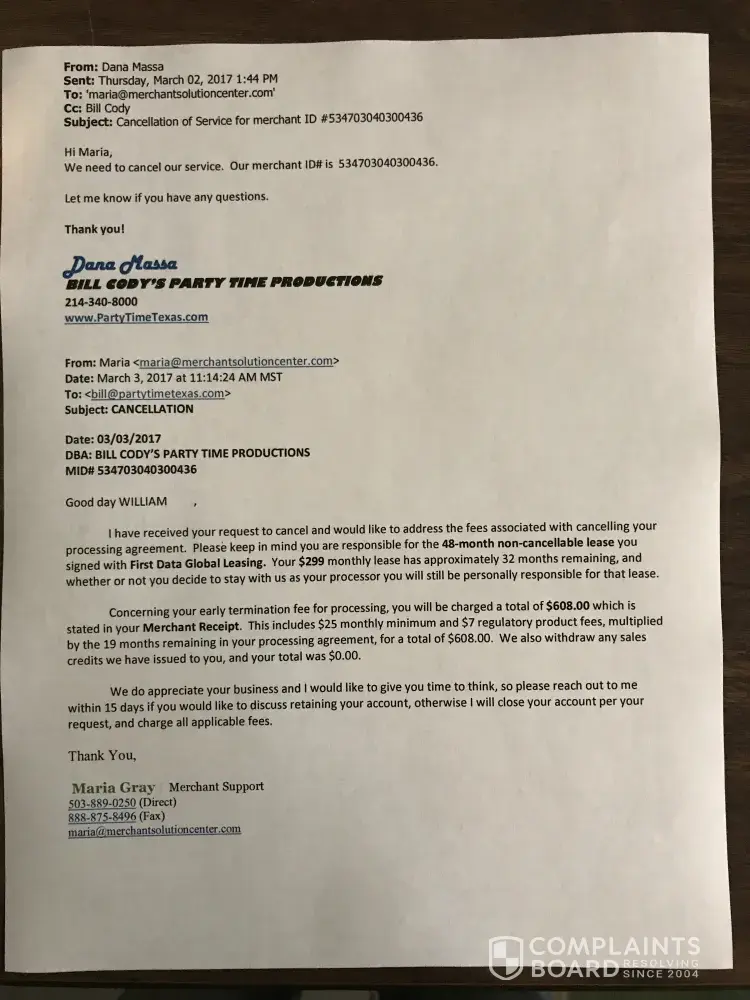They contacted us saying that they could save us money on our credit card transactions. We signed up and they sent us 2 FD130 duo terminals and 3 FD35HW pen pads. I contacted Dakota Hulsey-Equipment Training Coordinator with Merchant Solution Center at [protected] to let him know that they sent us too much equipment, that we only needed 1 FD130 duo terminal and he told me to keep it just in case one of them breaks down. He told me that they would not charge us for it. The first year fees were in line with what we had been paying with our other merchant processor, then they almost tripled at the one year mark. On 1/30/17 we called the number on our statement - [protected] and was informed that for future customer service we would need to call [protected]. They did connect us with Kevin and he told us that "yes, the fee was definitely high and that it looked like our clients rewards cards were causing the increase, but it was still around 5.4% which is way too high. He said he would turn this into his supervisor to review and see if they could adjust the rate, but that it would take about 4-5 business days before they would get back with us. Never heard back from anyone. We started calling the [protected] number and after numerous calls, leaving messages on a voicemail we finally contacted the number on our statement again and they were able to connect us to a Jennifer. She said that we would have to email Maria a cancel letter (see attached email we sent and the email Maria sent us). Our last conversation was with Chantale - [protected] and she told us that we will owe $10, 000 plus due to us backing out of a signed contract. We told her that the processing fees along with lease fees were far higher than what we had been paying in the past and certainly not what we were promised when we were coerced into agreeing to this long term lease. We feel they broke their agreement with us and we are preparing for litigation if necessary.