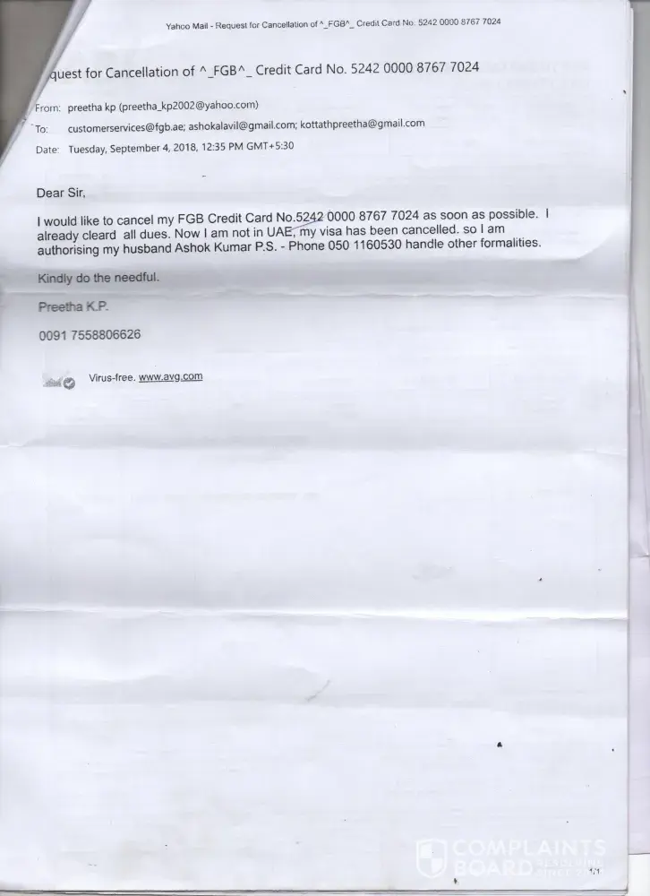 I had blocked the aforesaid Credit Card through proper channel in April 2018. During that period an amount was outstanding to be paid to your bank. That outstanding amount was duly paid in August 2018 and a sum of Dhs.3.18 is in the credit of my account. Subsequently, I had made request through email (attached) for permanent cancellation of my credit card