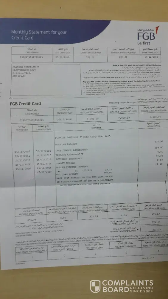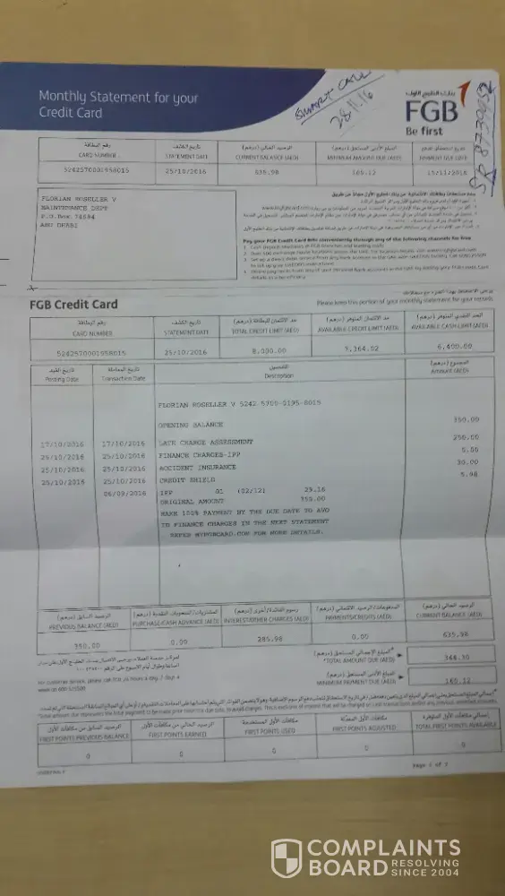 I am a very disappointed customer of fgb bank, after complaining several times regarding irrelevant amount of aed 60 for accidental insurance is charged to me without my authorization, even after my cancellation request and assurance provided by the agent again aed 30 was charged to me for the 2nd time and still the clarity is a question mark?