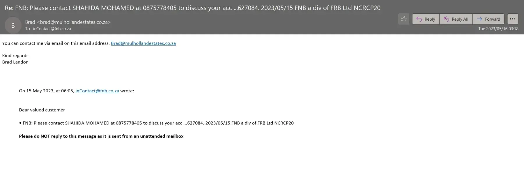 That is why the reference. I went to the useless Woodbridge branch in Kempton Park to ask why they continue to drop my facilities, which I rarely use and they promised to let me know. Two days later I get a nasty, rude mail telling me basically because I am a delinquent with ALL my accounts, cards , loans etc. Which by the way is not true. Did not use overdraft basically for more than 2 years, I don't have CC with FNB and never been late on the only loan I have of R 80K to buy a car not even with them.