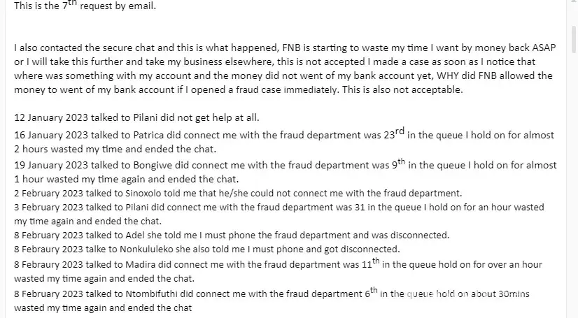 9 January 2023 I tried to login to my banking profile, but with no luck and said that my password is incorrect but Im using this password for almost a year. I also tied to change the password I did not receive any otp's on my phone. Then i started to get worried and tried to use secure chat but could not go onto that because of my password. Im overseas in Ecuador at the moment and have the card in my possession. After I struggled for hours to go onto my banking profile I set to get message son my cellphone from FNB and suddenly I saw that my card was cloned and someone in Cape town is using my card. I immediately contacted the fraud department and opened a case, bu they still allowed that the transaction went of my bank account WHY this is unacceptable. They could have stop that. And after 10 emails and tried to talked to any staff at the fraud department via secure chat no luck at all. They are wasting hours of my time. I want this sorted out ASAP this is not acceptable at all to treat a customer like this.