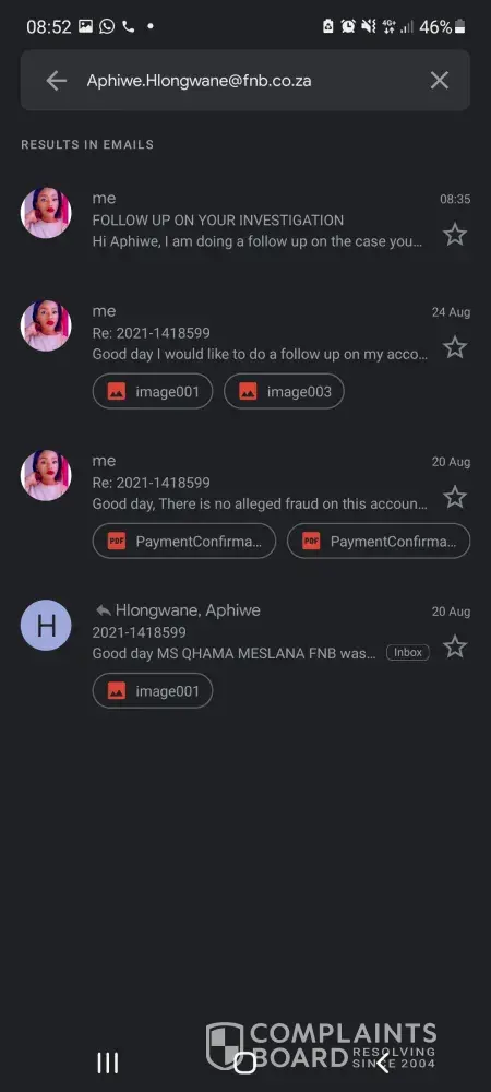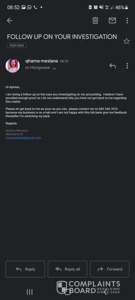 On the 18th August 2021, I received an email from Aphiwe Hlongwana stating I have received proceeds of alleged fraud. I did provide proof and an explanation to what was it about. I have been requesting feedback from him with no reply and what I am not happy about is that my business has been put on hold and I just want the verdict of the case so I close all accounts with FNB and switch banks I am not happy at all