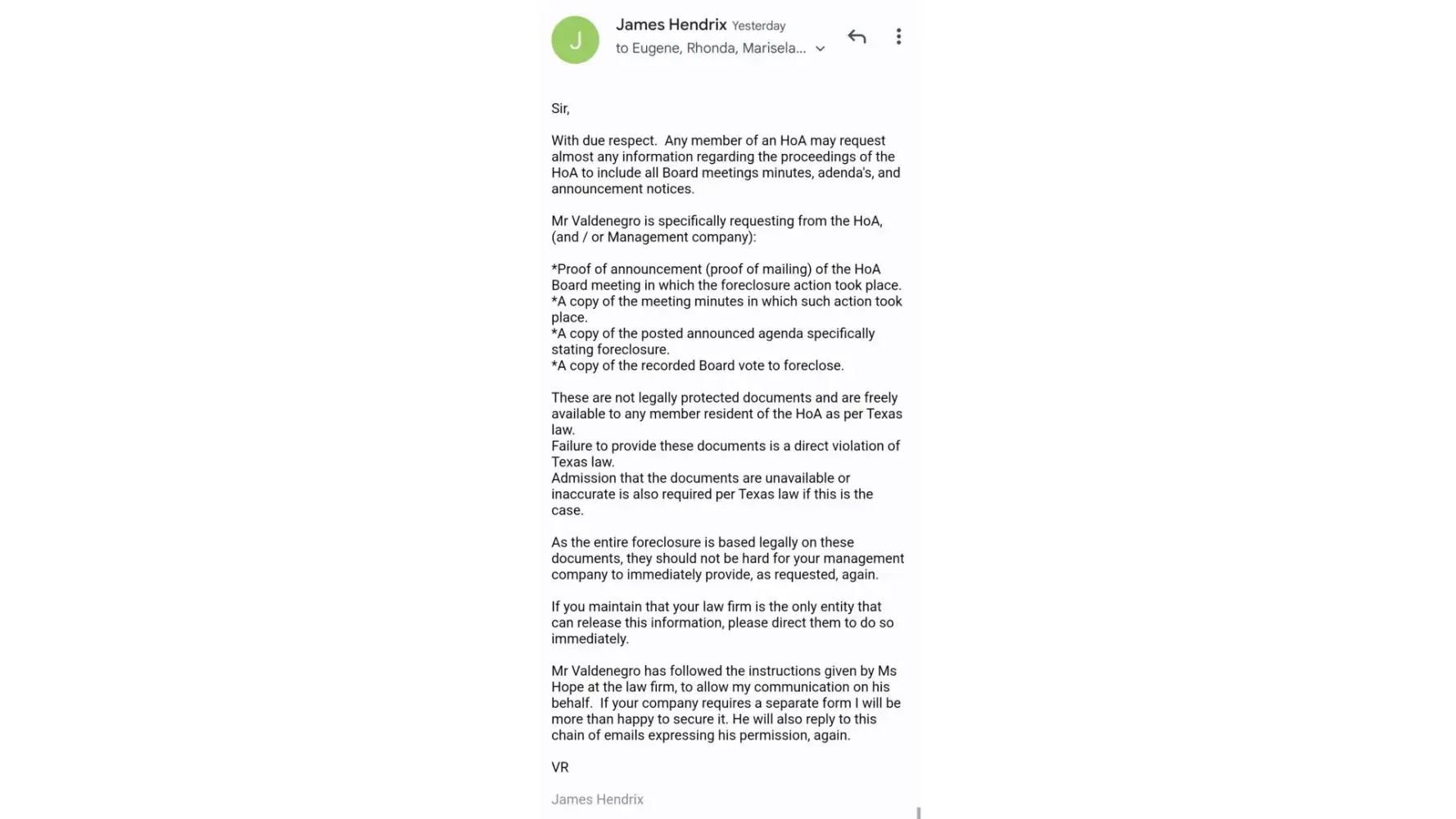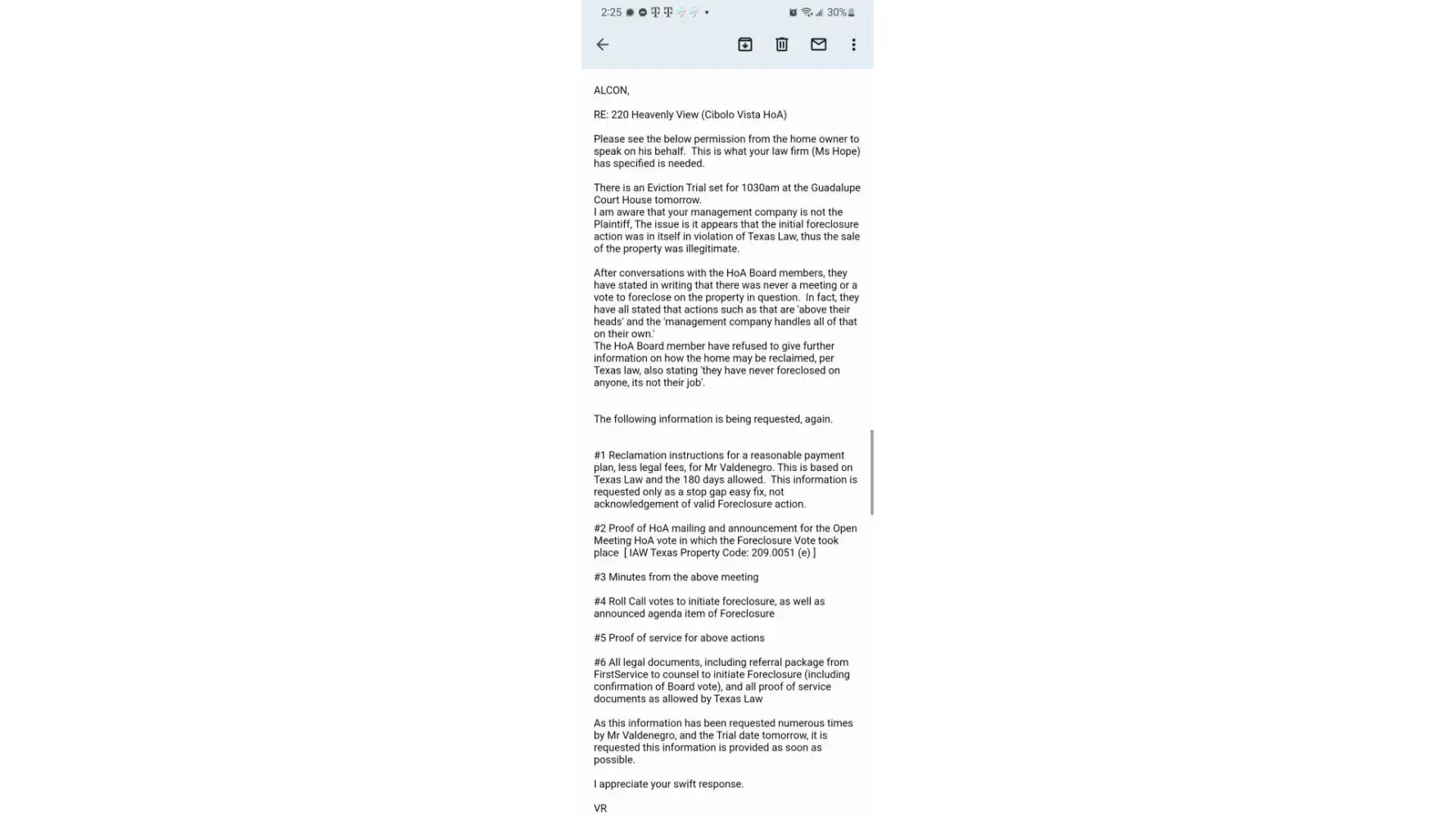 First service residential has illegally foreclosed on my property here in tx. The hoa board of my community has no knowledge of my foreclosure. According to state law the hoa board had to publically notify the community of a board meeting to vote for foreclosed. No public notice was sent, no board meeting, and no vote. I habe asked them several times to provide me wirh these documents. They are either unwilling or unable to produce them. Which is also a violation of TX law. The HOA board members have all blocke and the management company refuses to comply with our requests. I admit messed up and missed some dues. They sent my house to auction on July 5th a company bought it and is now trying to evict me.