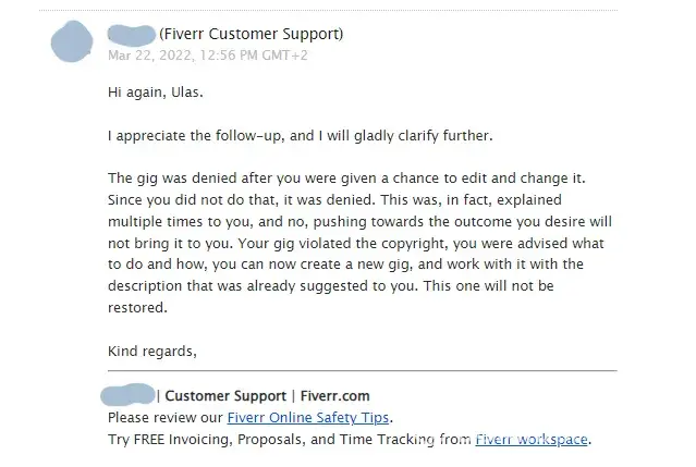 5. It is still possible to restore the Gig, by removing whatever they think against the copyrights but they don't want to do that for a reason that they don't share with me. In fact they don't have a valid reason but they want to oppress their freelancers to save from their expenses. This way is easier for them than helping freelancers to remove anything which is against the copyrights.