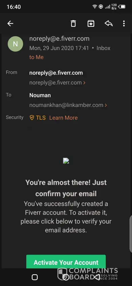 Then I created another Fiverr account at 17:41, on 29 June, 2020, and received an activation email that is also attached in the screenshots.