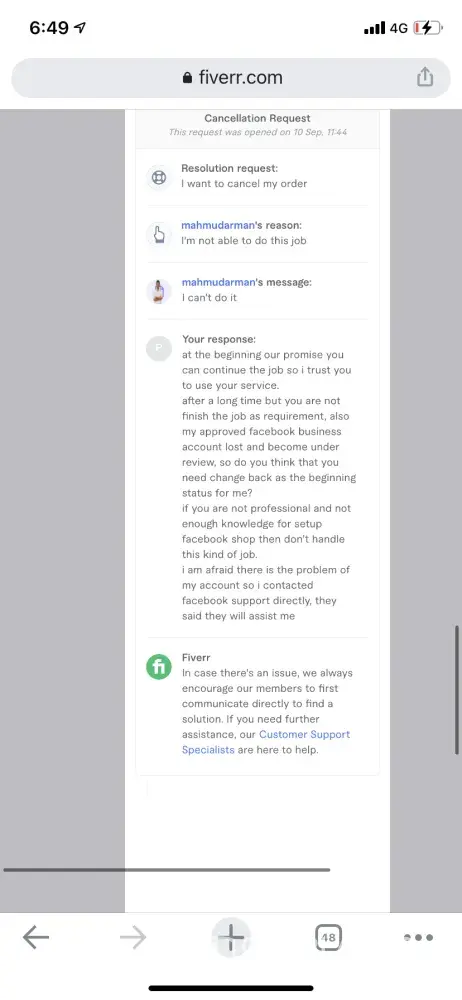But Fiverr is very clearly I don't want cancel the order because the seller make a mistake cause my Facebook business account lost and o need the seller fix their mistake and finish the order but Fiverr know that still cancel the order!