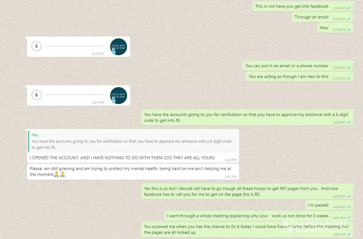 We create facebook pages for our clients. The Fiverr seller is holding them hostage for money. The issue with this Seller is very simple. The seller has his telephone setup as the "Verifier" and the "Authenticator" on 10 of our Gmail and Facebook accounts. He can simply REMOVE his telephone number 1st. Second, he has to give us the CORRECT passwords! We have a two-fold problem: