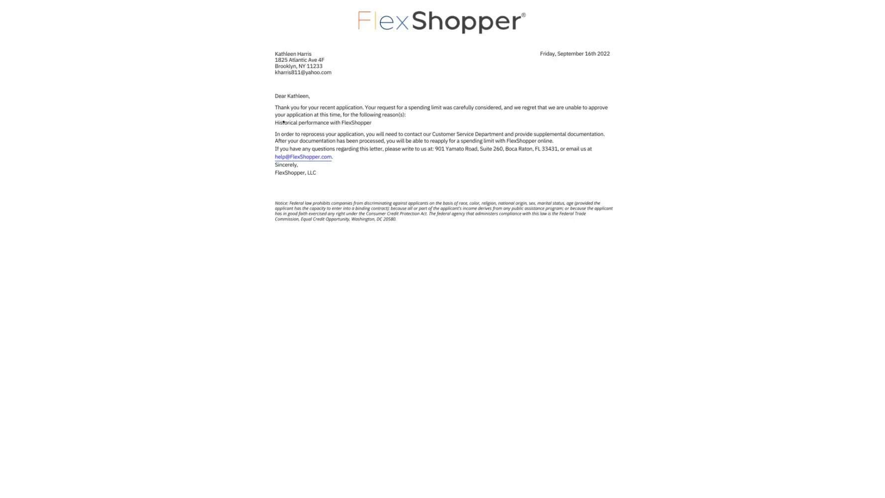Hi my name is Kathleen Harris, I applied for a flexshopper account and was denied because my son which is 44 years old had an account with them and because our address is the same I was denied. My point is how can you hold me responsible for another person account, my son's account has nothing to do with me he don't pay my bills and i don't pay his I should not be denied service because of this, I also informed them that my son's wife which has an account with them also live at the same address i was told that she might have fell through the cracks, Very poor customer service and not a fair company, You cannot hold another family member responsible for someone else account if they did not co-sign for that person there guidelines should based solely on the person that's applying for the service not on what other family member used the service.