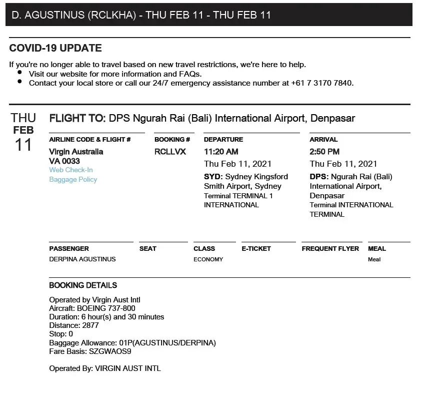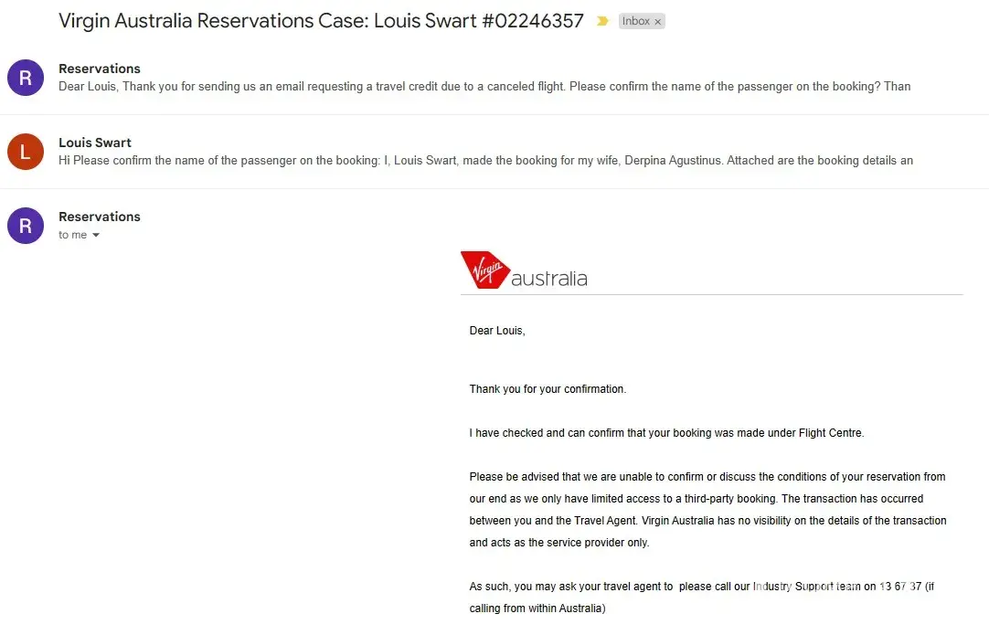 I booked and paid flight centre directly, so Flight centre can verify my payment, and all previous email correspondence regarding Derpina booking and cancellations. Derpina flew to Sydney, but the return Virgin flight was cancelled. I would like to redeem the flight credit, and book a new flight.