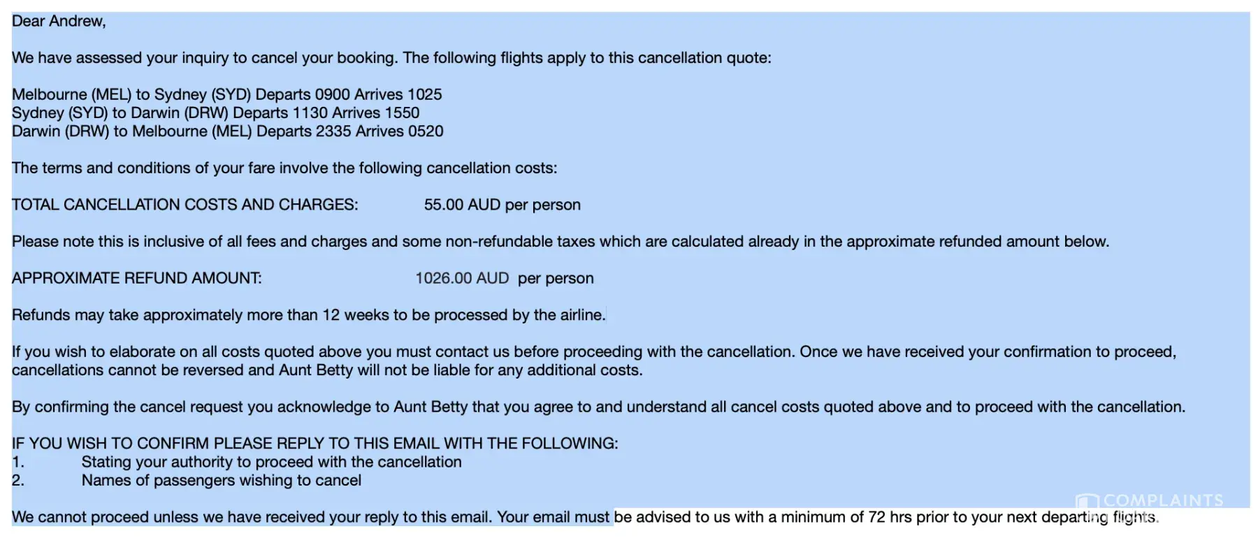 We would now like to resolve this matter and recover our losses from Flight Centre as quickly as possible and avoid the formal involvement of Fair Trading or legal proceeding. If no formal response is received within 14 days of this email, we will look to make a formal complaint with Fair Trading.