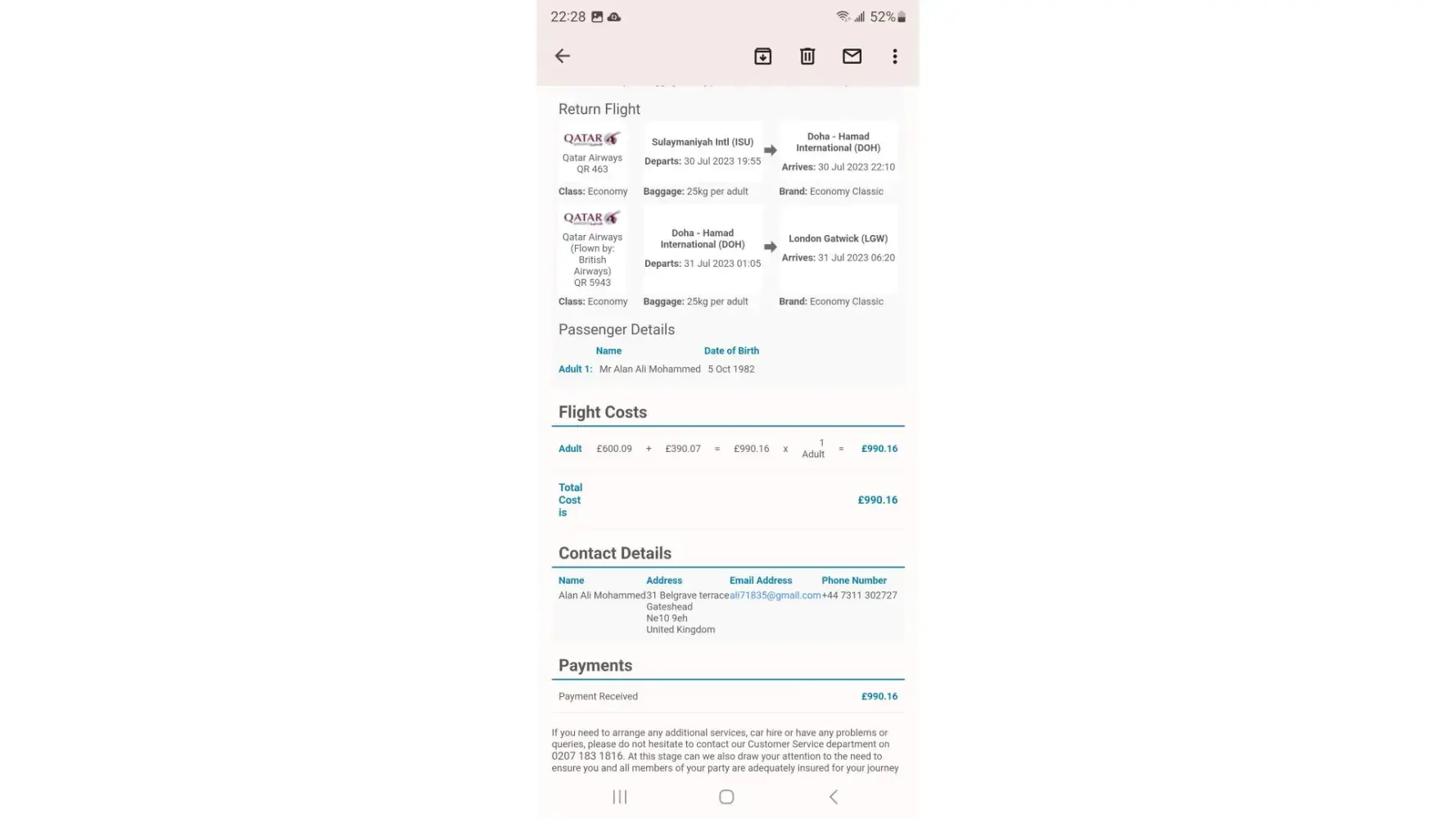 I had called on the same day to make a payment for a flight to Gambia . The original who was dealing with my phone call asked that i send a confirmation email to say i received the flight details , to which i did .The phone call was cut off and i called back and was dealt with by another colleague who promptly took payment and i received receipt.