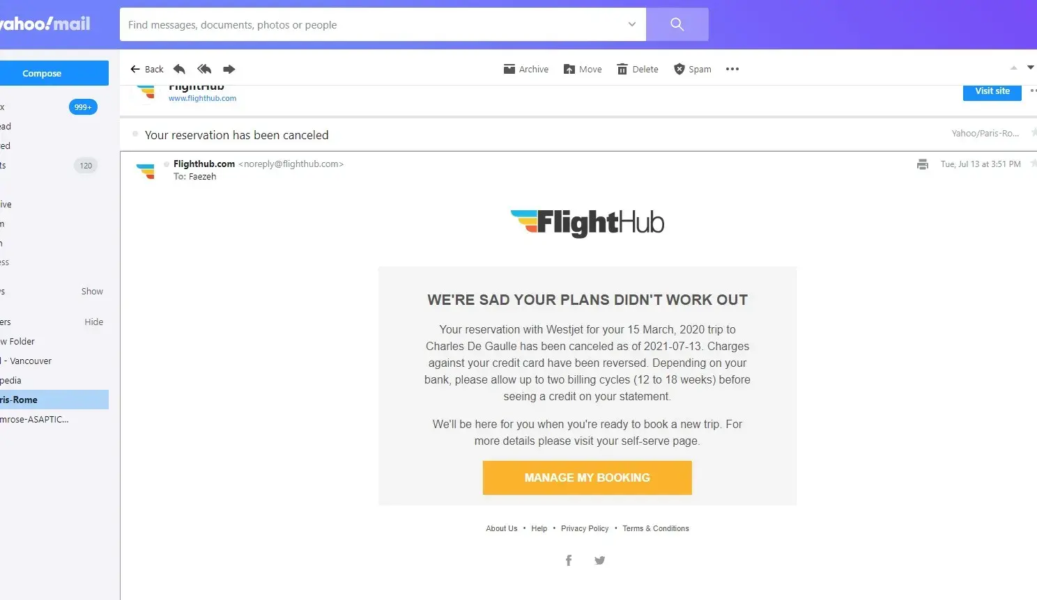 Your reservation with Westjet for your 15 March, 2020 trip to Charles De Gaulle has been canceled as of 2021-07-13. Charges against your credit card have been reversed. Depending on your bank, please allow up to two billing cycles (12 to 18 weeks) before seeing a credit on your statement.