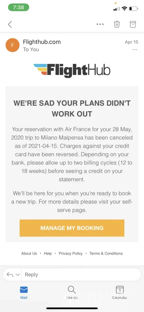 I received the email in the attached photo on 15-April-2021 indicating " Your reservation with Air France for your 28 May, 2020 trip to Milano Malpensa has been canceled as of 2021-04-15. Charges against your credit card have been reversed. Depending on your bank, please allow up to two billing cycles (12 to 18 weeks) before seeing a credit on your statement."