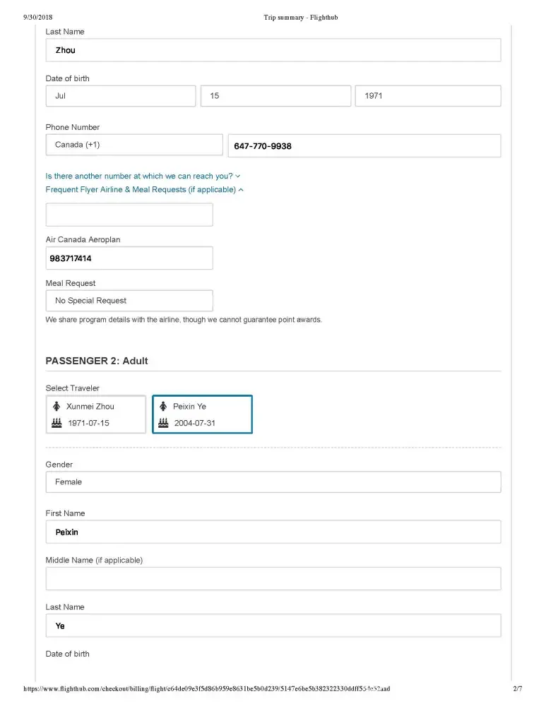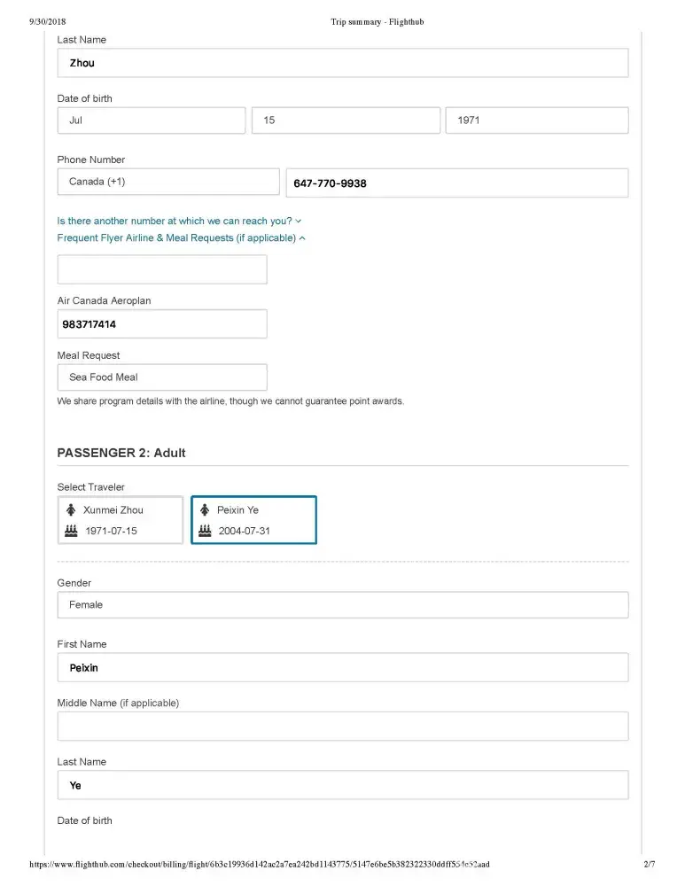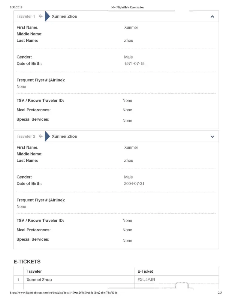 4. Picture four is the booking info for my second booking, where my daughter's name is accurate, but the gender changed into "male" again.