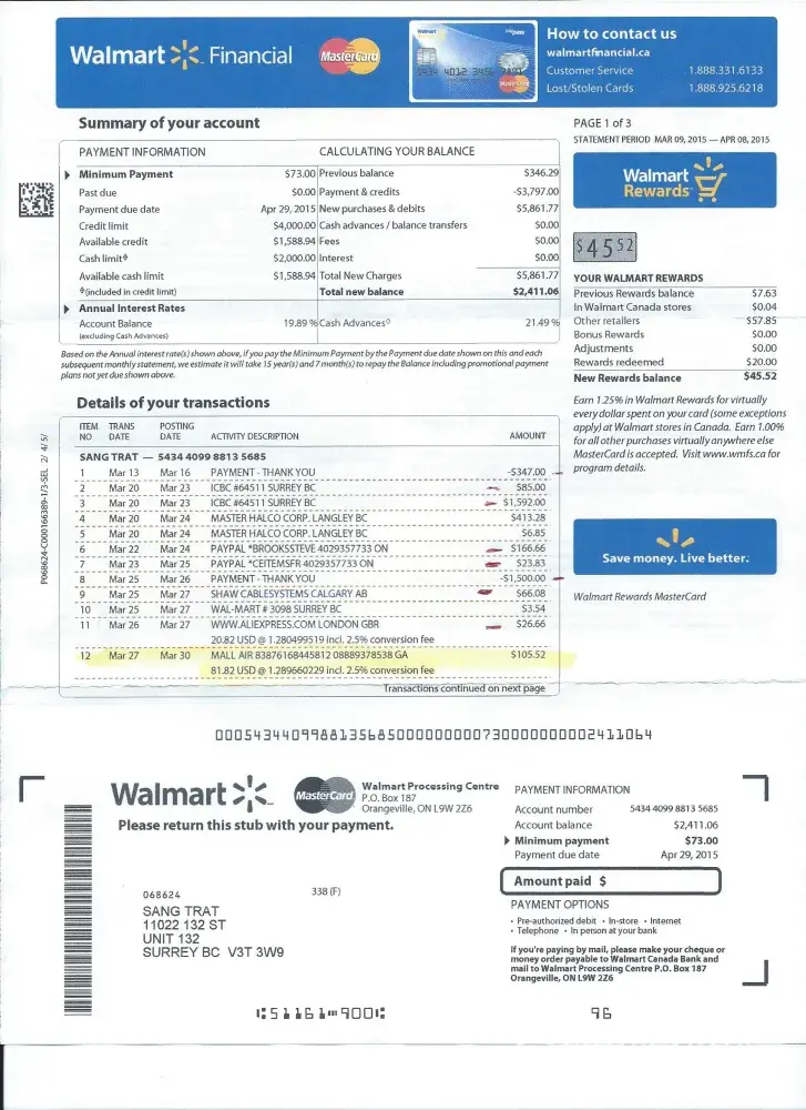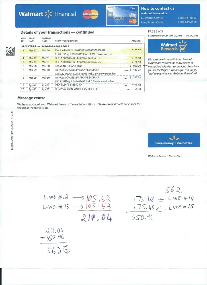 However when i received my Master Card statement, they showed 4 items charged total of $562.00CAN.