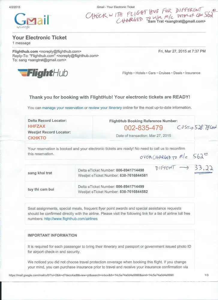 I booked on line for the air tickets with Flighthub booking #[protected] March 27 2015.