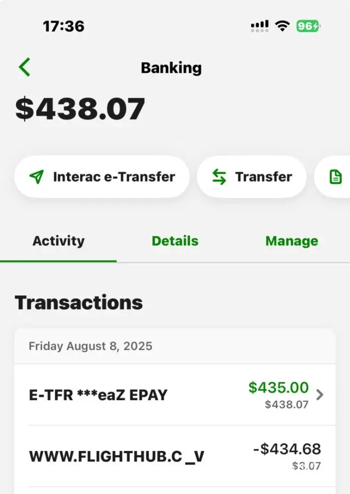 There was no other notification or information, I did not receive a ticket or any confirmation. But at the same time, on the ACB app, there was a notification that I had been charged CAD 1,663.12. At the same time, I also received an email from ACB about this payment (attached email screenshot).