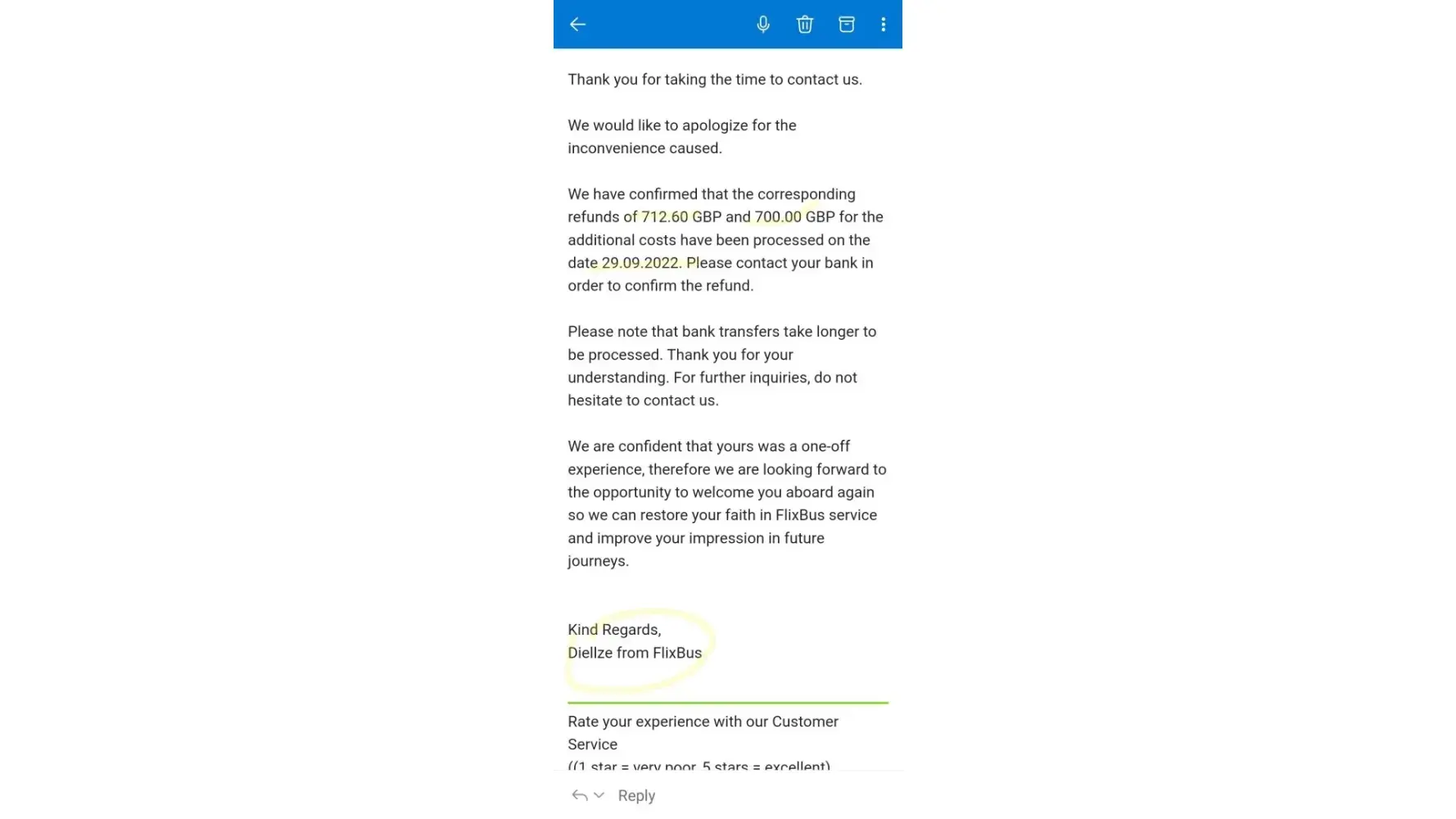 This letter serves as a formal request for two full refunds on the cancelled journeys we had with Flixbus and additional costs as promised. I will now from this letter request a further £500 before I take this to Financial Ombudsman with my medical report of depression related to this.