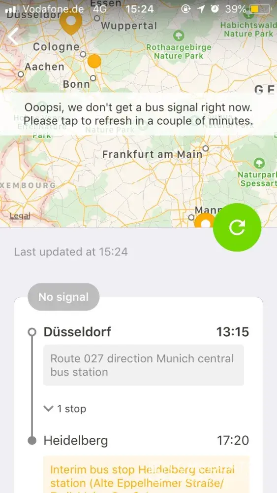 We were informed that The bus from Stuttgart to Mannheim was delayed by ca 55 mins but in fact it was 1 hr 10. We did not make the connecting bus to Hahn.