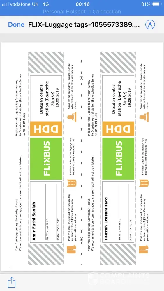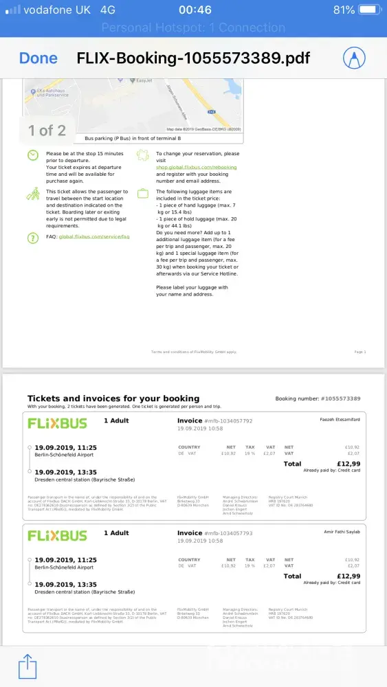 On 19th of September 2019, my partner and I were scheduled to go to Dresden by the Flixbus. Our ticket was at 11:25 in the morning. We arrived at the station at 11:10 am and at the same time a bus passed us. We missed the bus and got in big trouble. I had paid £25 for the ticket and I ask you for the full amount.