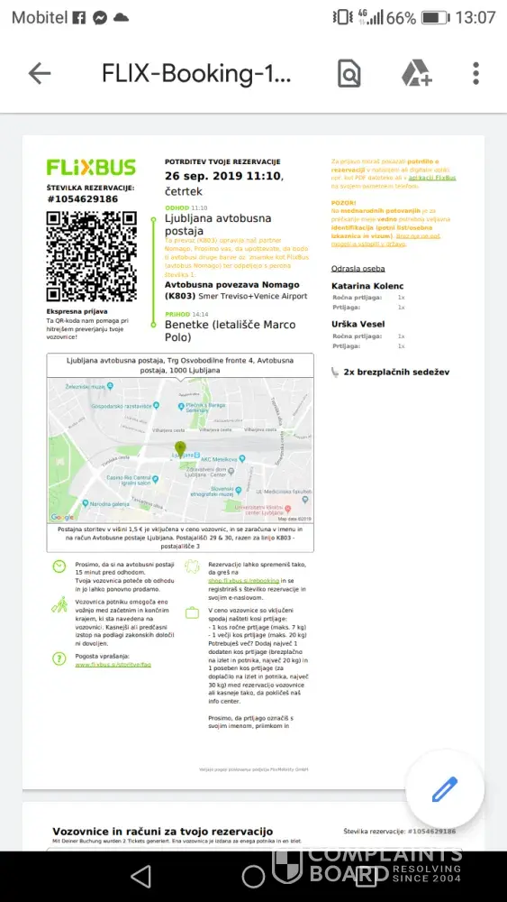 Since we have not seen the e-mail about the last reschedule, we came to the main bus station Ljubljana. The bus was 20 minutes late and the driver could only speak Italian and refused to let us on the bus. He explained that the wrong bus was sent and is not big enough for all passengers. Only then we checked the mail and noticed the e-mail about the reschedule. Since we had a flight from Venice at 18:00, the 20:40 bus would be too late for us to catch the flight.