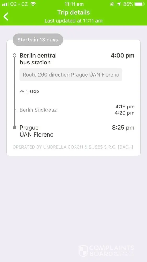 Confused from this lack of clarity regarding the bus departure, I noted that there was one stop at 4.15pm at ‘Berlin Sudkruez'. As I had no certainty of where the departing station actually was (I understand later it was actually Zentraler Omnisbusbahnhof Berlin), I decided to go to the stop where I knew I could get my bus to Prague. The bus arrived on time at 4.15pm, however, the next part absolutely shocked me. After explaining my difficulties and lack of clarity in identifying the departing station, and with my ticket clearly showing that I had purchased a flix bus ticket for that exact bus (route 160), the bus driver simply refuted me and blocked me from entering the bus. After pleading with him to let me on he refused, he advised that there was another bus to Prague which is was coming and was indeed a flixbus. He then closed the door and drove off. This was in front of around 15 people. There was no other bus, what he told me was a lie. I could not believe how this bus driver treated me, it was disgraceful. Worse more, it was the day of my birthday!... which I explained in my id!