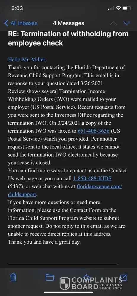 Description: I have made numerous calls numerous complaints numerous times on your chat and now I am emailing for the last time. Next week I will be contacting the governor and internal affairs. I have a case that is closed and you will not send the termination of child support paperwork correctly to my employer. It needs to be sent electronically to the deduction unit if you have questions on how to do this you can call [protected]. My name is Jason Miller and ss#[protected]. Phone # [protected]. I have requested several times for the local office to contact me and Provide me with the termination paperwork and this will be my last.