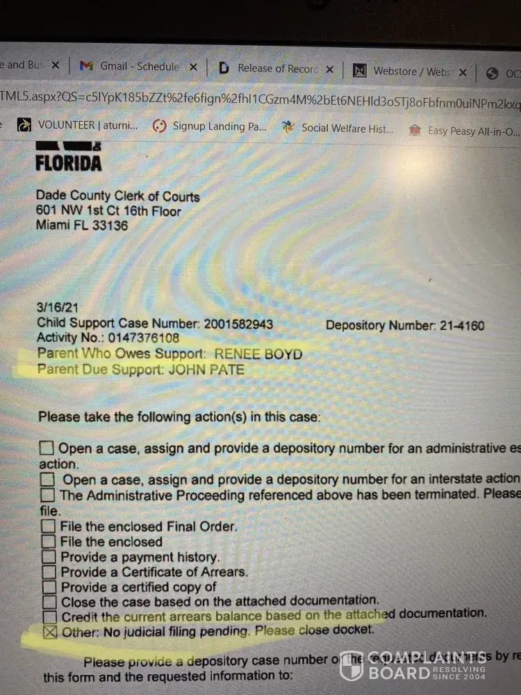 FDR SAO refuse to obtain a hearing to calculate child support on a Miami area City Manager. The child is being failed due to noncompliance and refusal to adjudicate the support modification of a Miami Dade area City Manager. The office closed the case November stating that financial documents was not submitted. The party info is